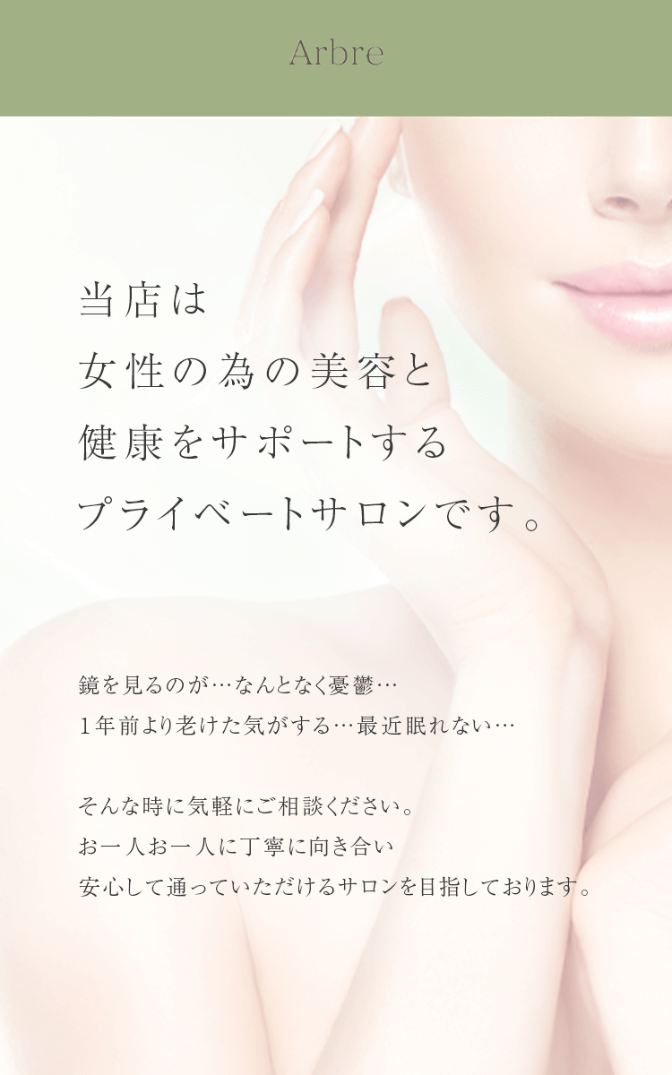 完全プライベート空間で、1人ひとりの悩みに丁寧に向き合うオーダーメイド施術。カスタマイズボディトリートメントやデンバマット施術を組み合わせ、心身ともにリラックスしながら、安心して通える環境で美と健康をサポートします。