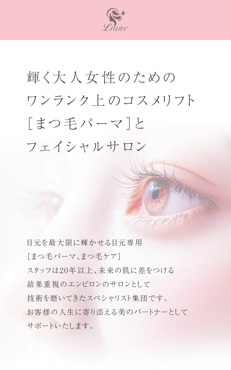 Lianeのまつ毛パーマは毛質改善にこだわり、傷みにくいコスメリフトを使用。20年以上の経験を持つスタッフが目元を最大限に輝かせ、一人ひとりのまつ毛の状態に合わせた丁寧な施術で、美しく健康なまつ毛を育みます。
